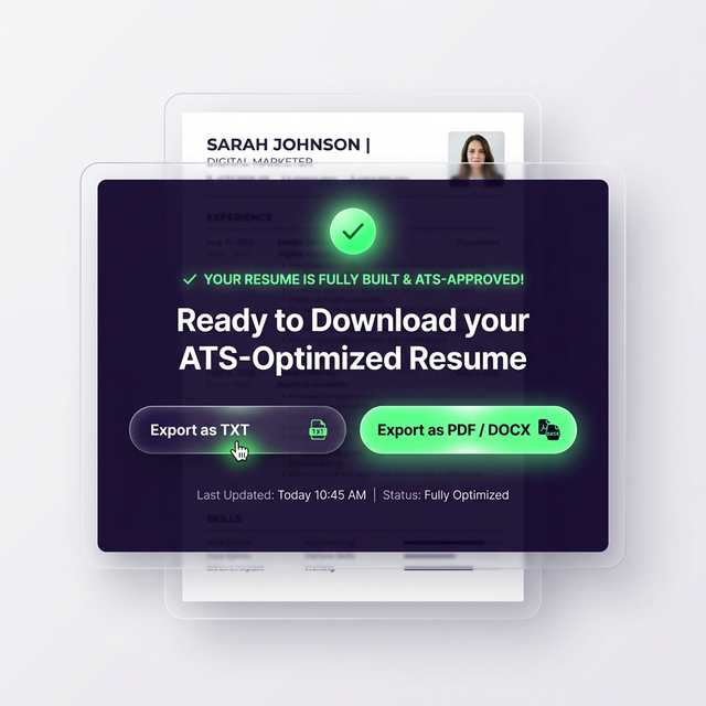 Download your completed resume directly as a clean .txt file, with PDF and Word formats coming very soon.