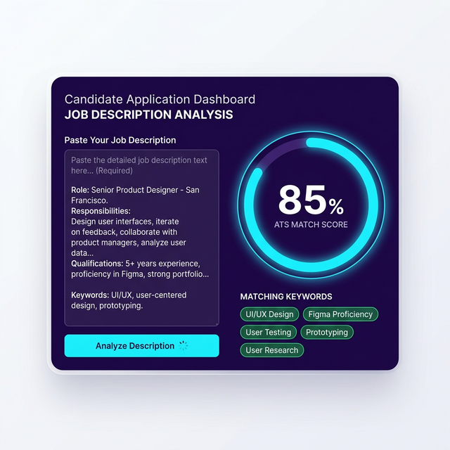 When you paste a job description, our system scans your AI-generated resume against the job requirements. It checks for exact keyword matches, missing skills, and overall contextual relevance, returning a score out of 100.
